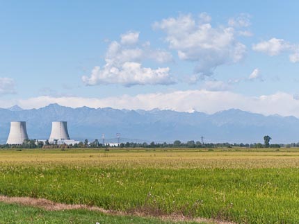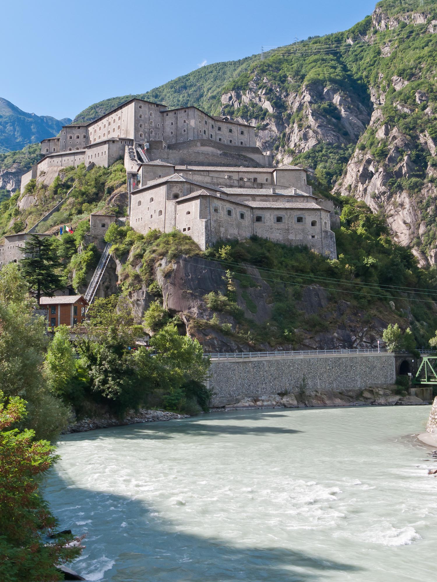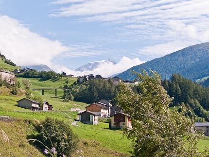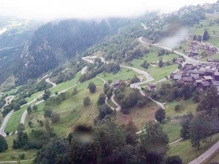 View of the Rhone Valley in Switzerland, looking toward the northwest. The glacier-covered peaks are the Berner Oberland Alps. The switchbacking road in the lower right corner leads up to Grimselpass. ^