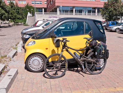 Well, this is my last day in Europe. I got up at 6:00 am and got packed and had breakfast in the hotel restaurant. When I carted my boxed up bike through the lobby and out to the shuttle bus, everyone around was staring at it, and me. But maybe it was just because of the way I boxed the bike – completely wrapped in cardboard except for the seat, which stuck up out of the top of the box and served as a nice carrying handle.