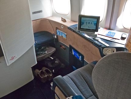 Here's the front of the First Class cabin. There are only two seats in the first row - my seat is on the right, the other one was unoccupied, so I essentially had this entire space to myself. ^