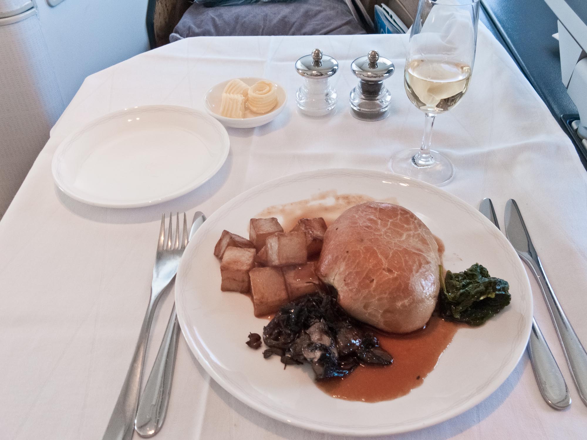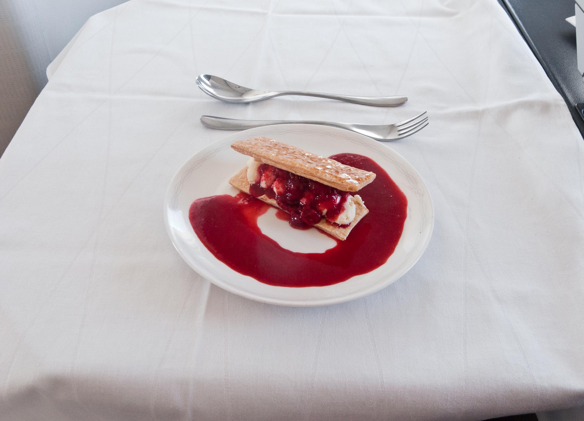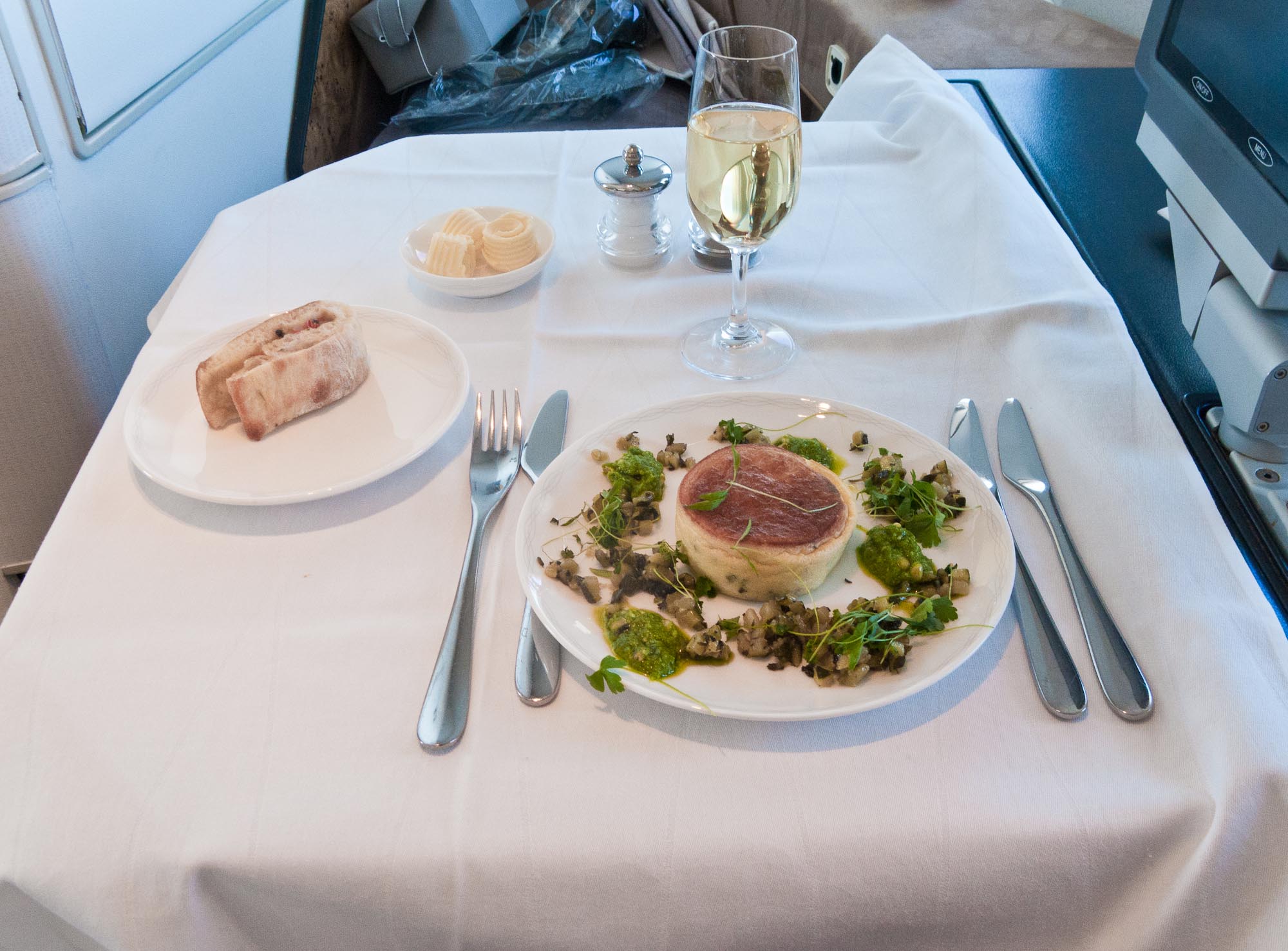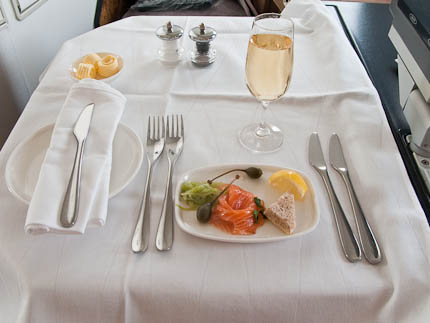 A person can really get used to the service in First Class. This was the first of two appetizers, followed by the main course, and then dessert, which was then followed by cheese, fruit, and sandwiches. And of course, there was plenty of champagne and wine. ^