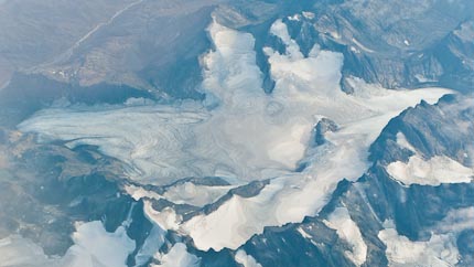 A small alpine glacier in southwest Greenland. The contour-like banding patterns are caused by ablation which has exposed multiple annual accumulation layers in the snow and ice. ^