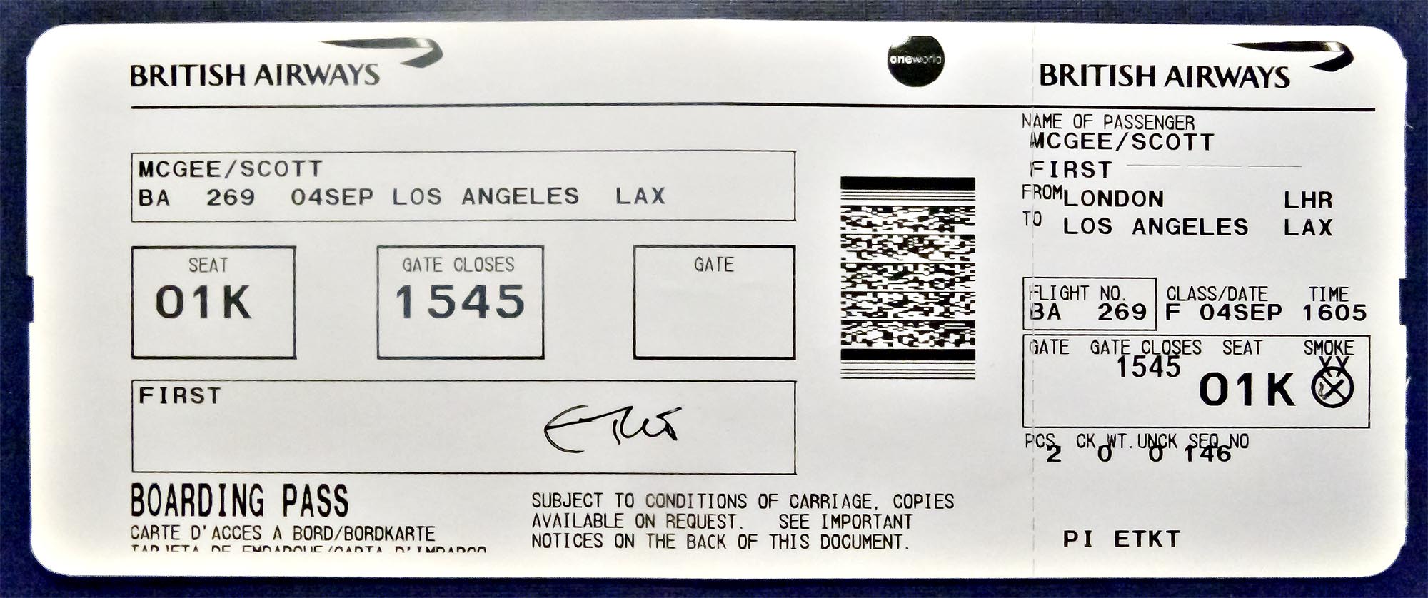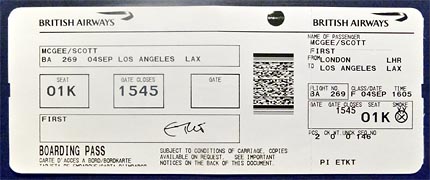 I doubt that I'll ever have another boarding pass like this one. British Airways, Boeing 747-400, First Class, Seat 1K, 11 hours non-stop from London to Los Angeles, all during daytime, with fantastic views of Greenland and the Canadian Arctic. It was the best flight I've ever had. ^