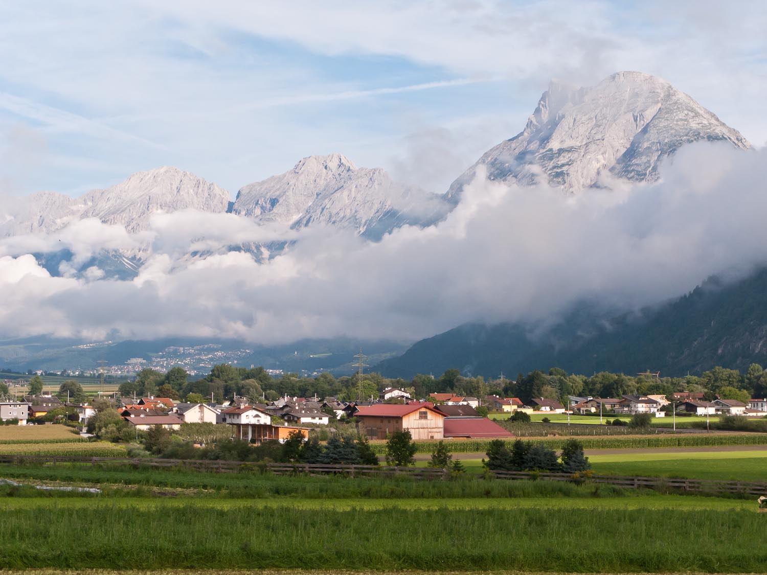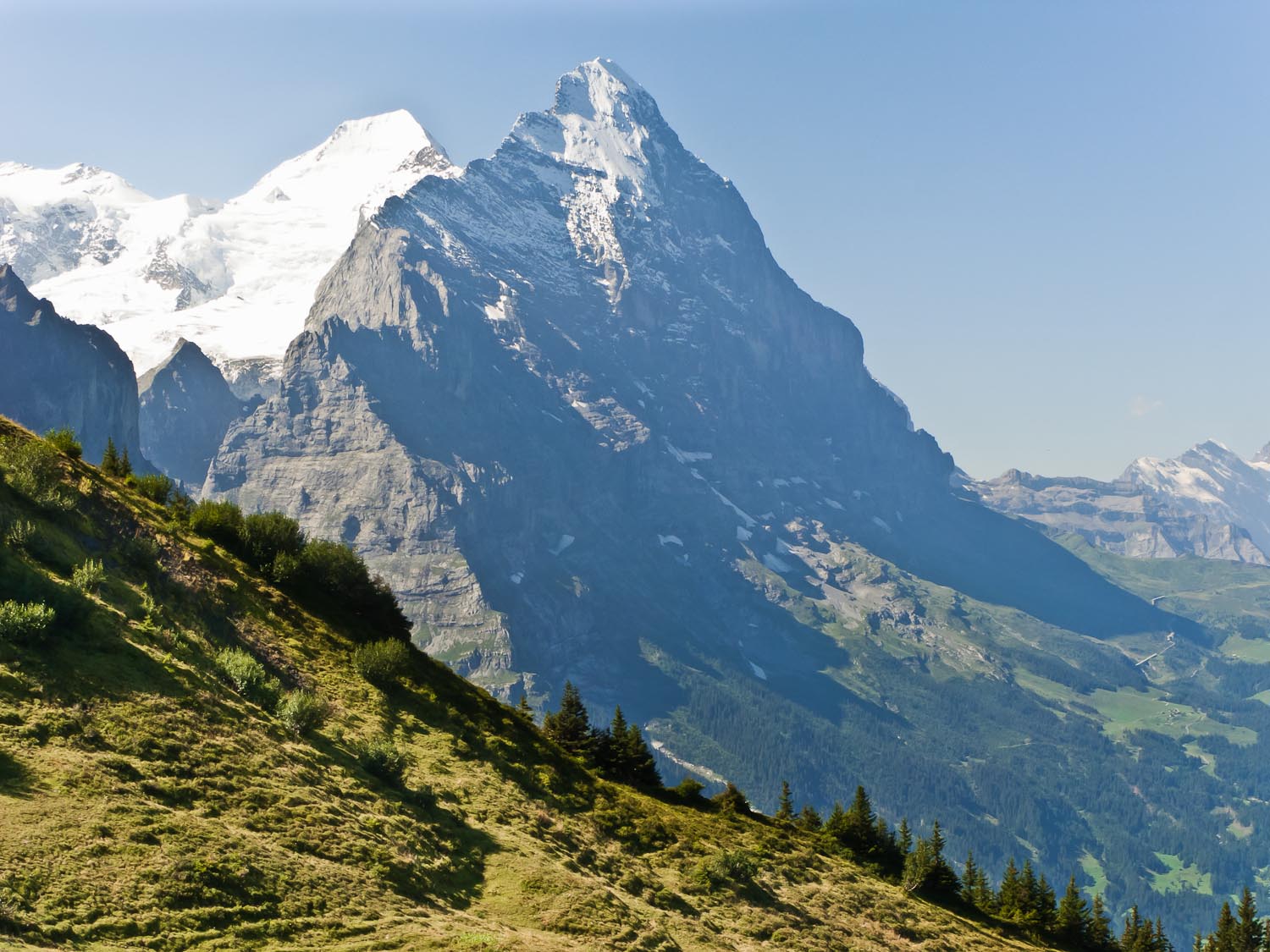 The Eiger, with the village of Grindelwald in the cloud-free valley to the right and below the Eiger. ^