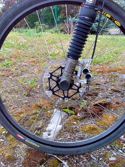 So, I once again opened the wallet (very wide) and upgraded. I replaced the Maguras with Hope Tech M4 hydraulic disk brakes. These are like the Ferrari of bike brakes. The calipers and lever bodies are CNC machined out of solid blocks of aircraft-grade aluminum. The calipers have 4 cylinders (2 on each side) providing the braking force. Of course, the important thing with brakes is how well they function – and these brakes are superb. But they also are just outright eye-candy – 100% bike bling! I had lunch at a downtown cafe today, and while I was eating there was a constant stream of passersby stopping and gawking at my bike. It was very entertaining watching them pointing at it and bending down to get a good look at the brakes. I saw more than one person mouth the word “Wow!” These things are just so much more than what people are accustomed to seeing on a bicycle. They have fantastic stopping power and look absolutely awesome – and despite the cost, they are definitely a worthy upgrade.