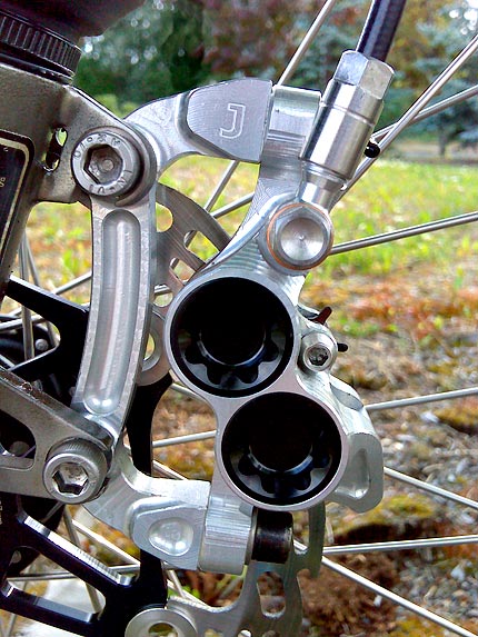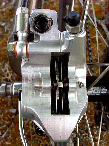 Top view of the rear caliper. The entire caliper is carved from a single block of aluminum, rather than the typical design of having two separate halves bolted together.